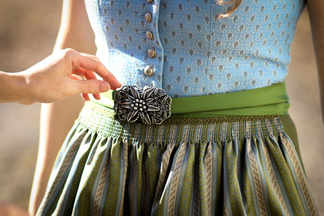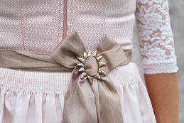 Schleifenspangerl zum kreativen Verschönern am Dirndl. Die Spangerl werden einfach an die Dirndlschürze "aufgesteckt". Sei es, dass ihr eure Schürzenschleife wie gewohnt bindet und anschließend die "Flügerl" der Schleife durch die hinteren Stege des Schleifenspangerl durchzieht oder ihr zieht es auf das Schürzenband auf und dekoriert es wie gewünscht neben der Schleife oder sogar hinten am Dirndl.